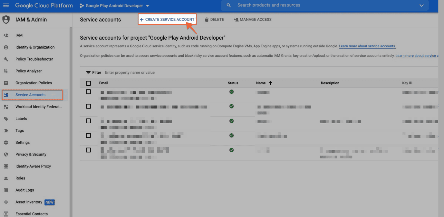 1. On Google Cloud Platform under Service Accounts tab click CREATE SERVICE ACCOUNT