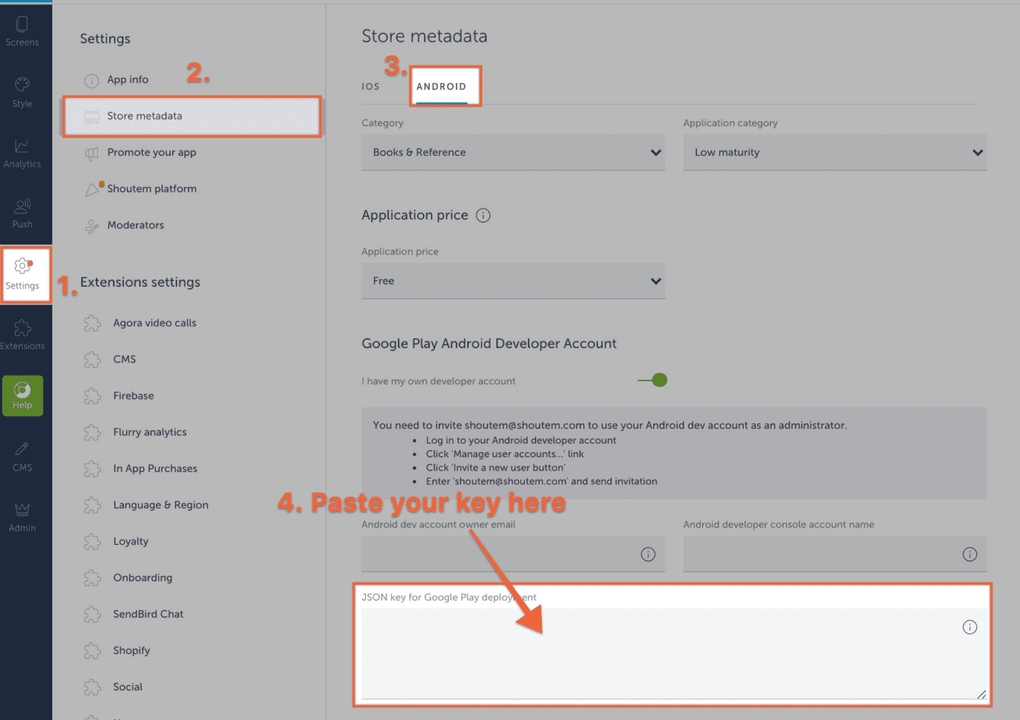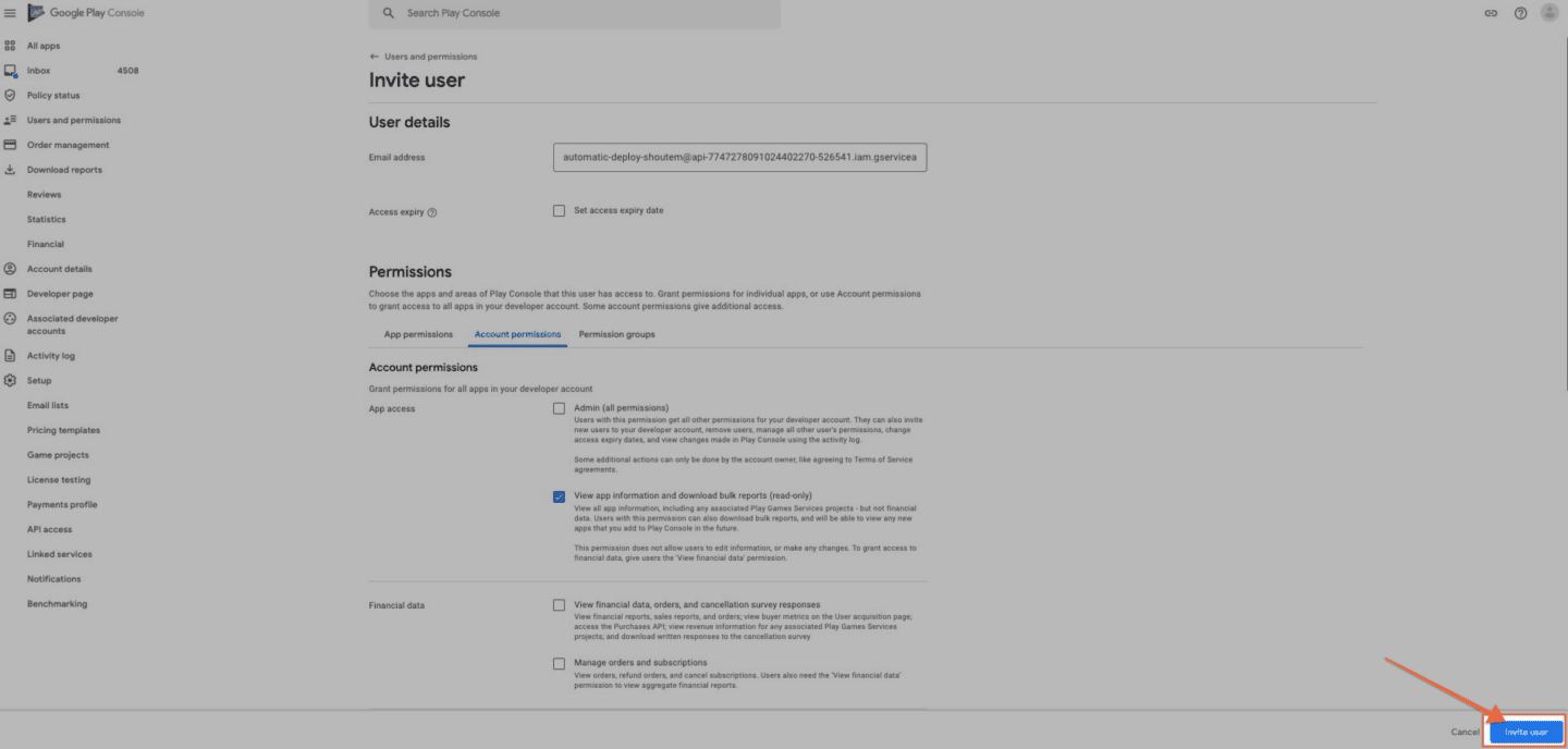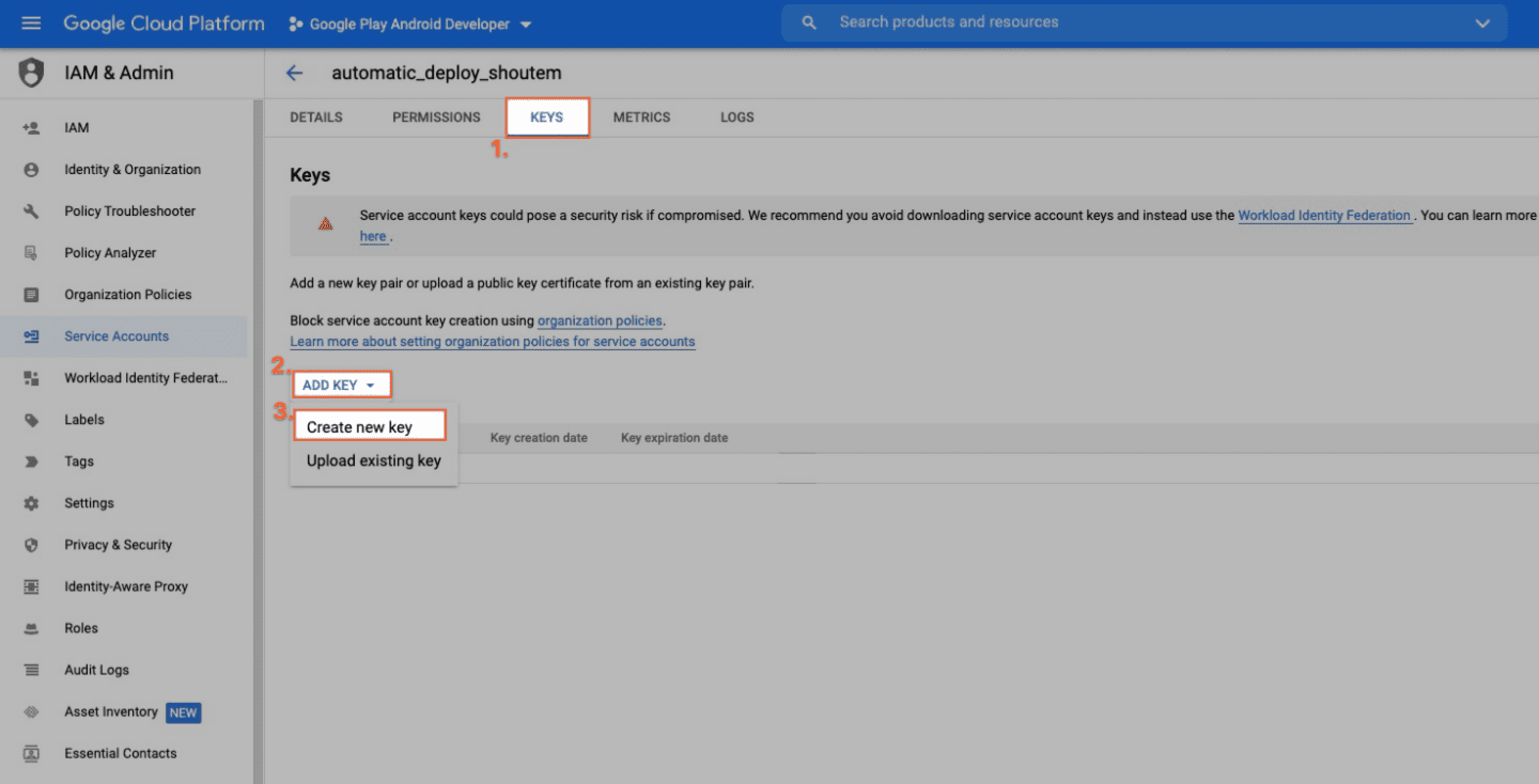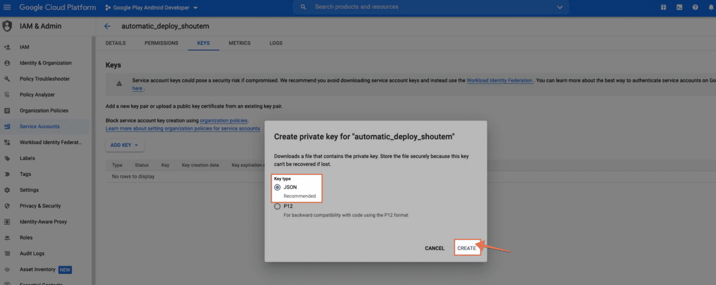 Note: Only the owners of Google Play Console account where the app is created can generate a JSON key for deployment.