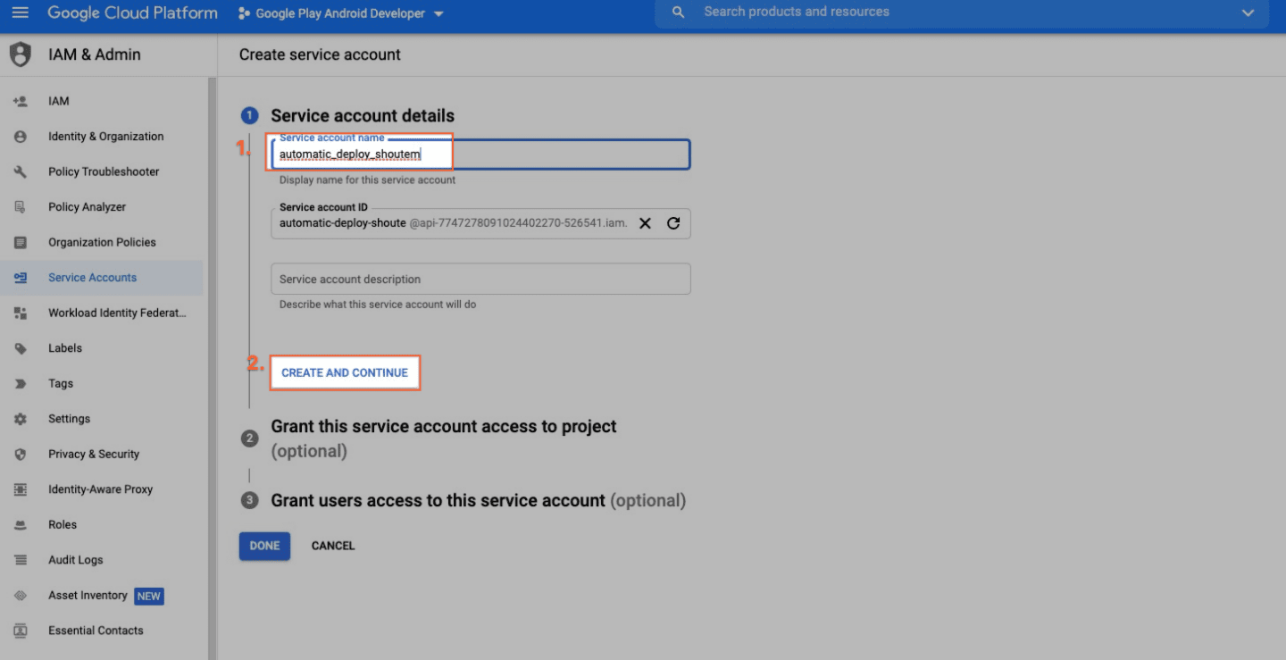 1. Name your service account, for example “automatic_deploy_shoutem” (Service account ID will generate automatically; Service account description is optional) and click Create and continue