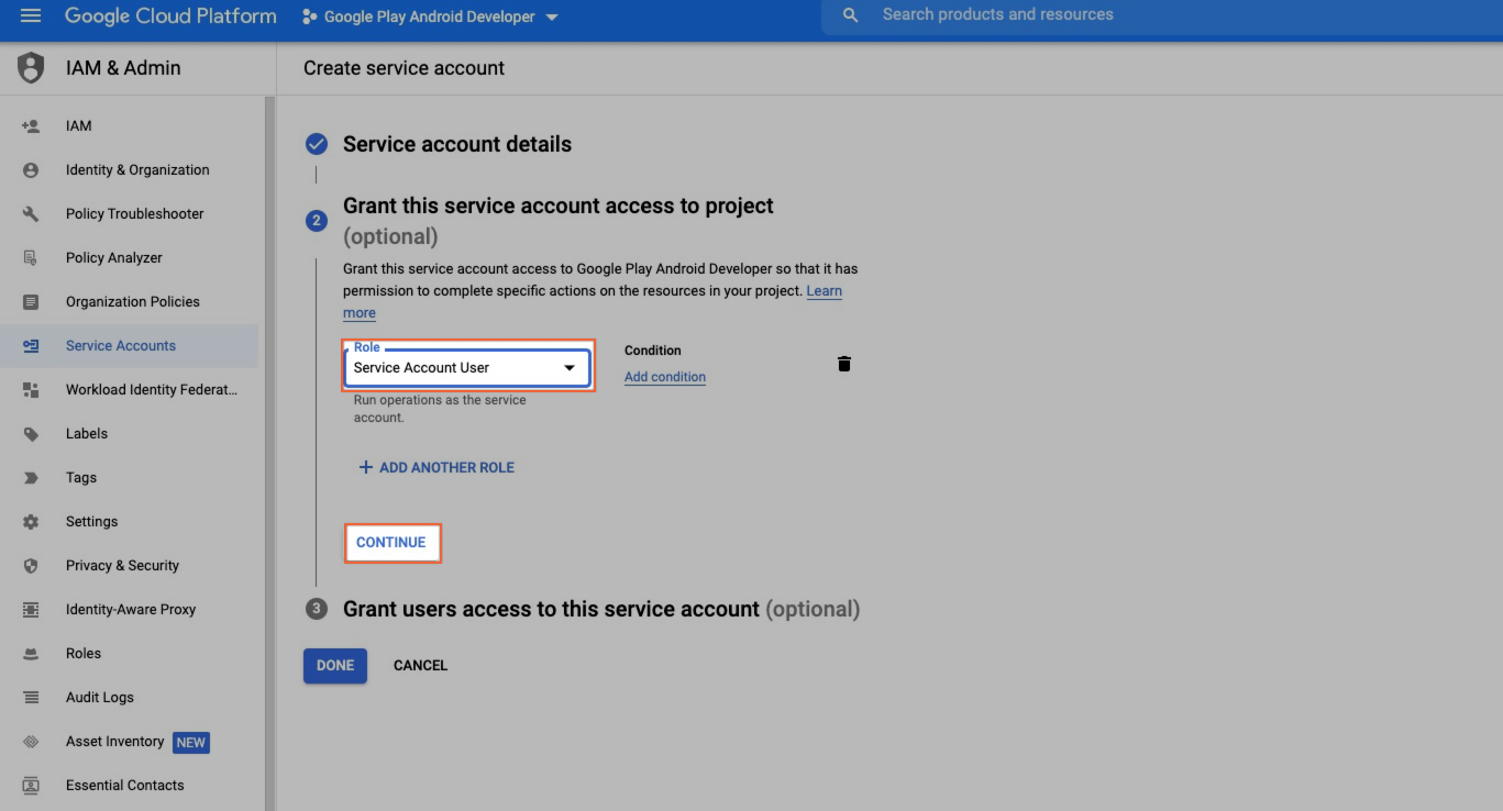 1. Choose Service Account User on a drop-down menu under Role and click Continue